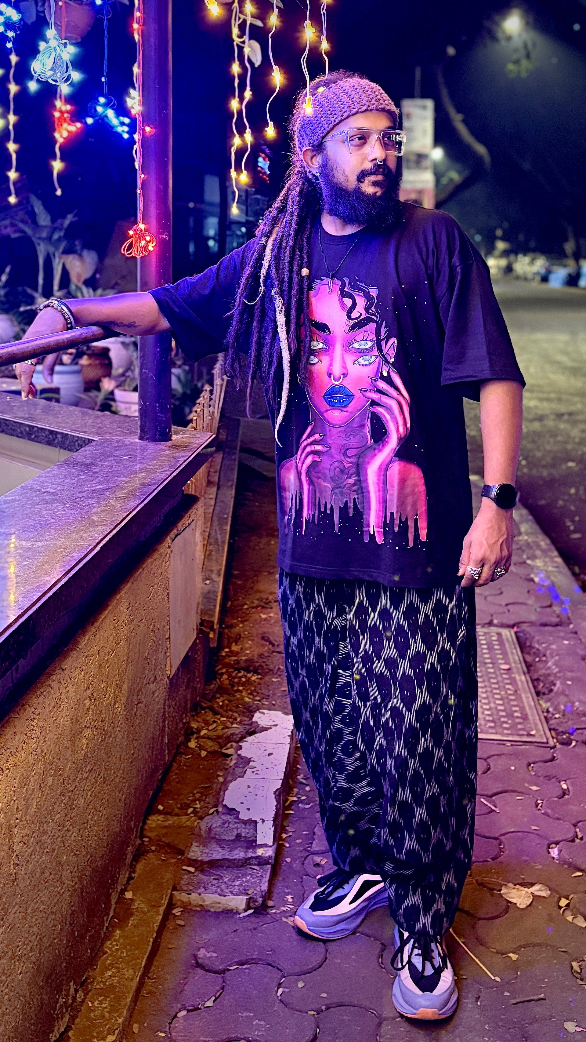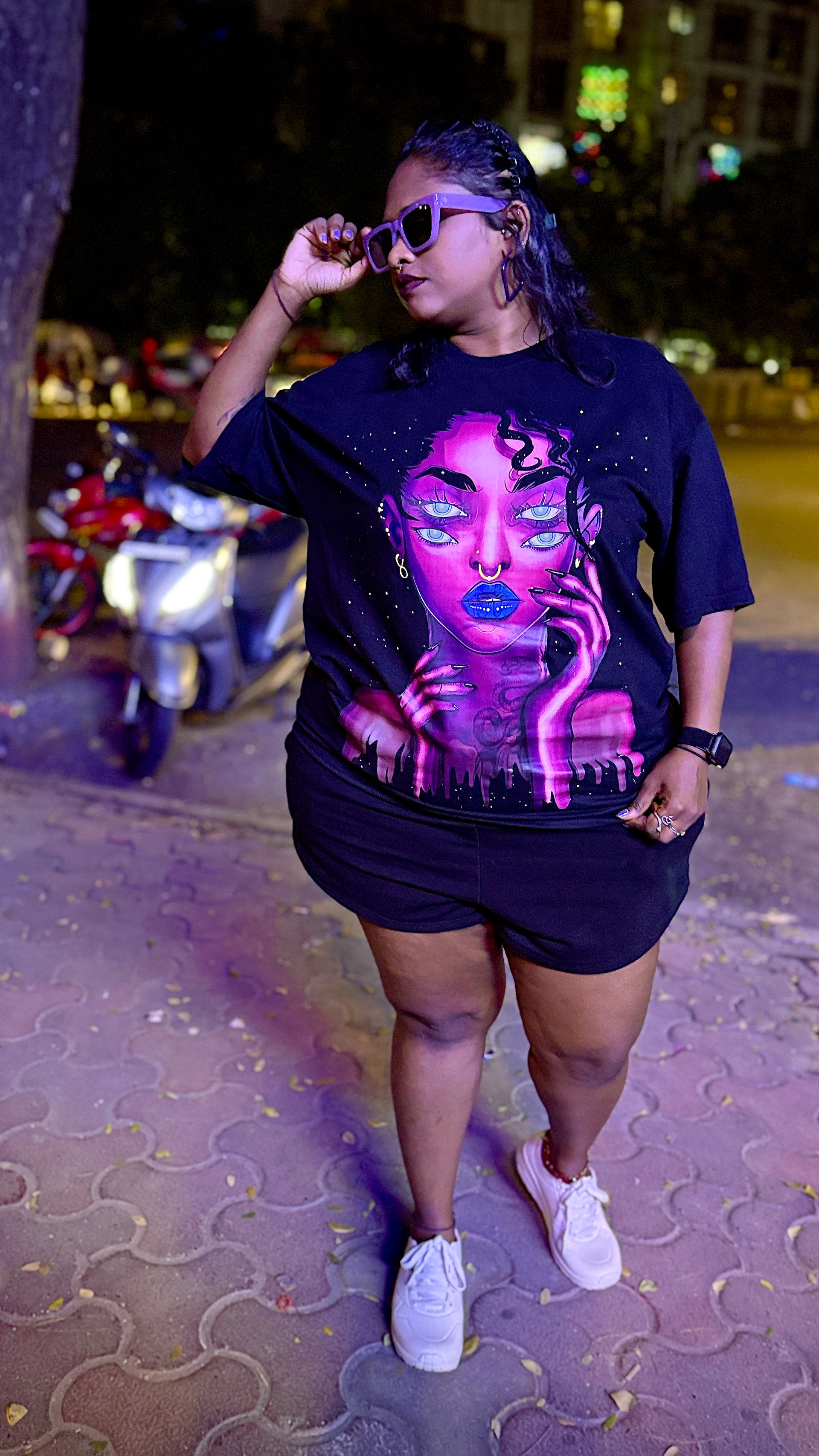 Cosmic Seduction is a trippy, vibrant purple vision capturing both beauty and danger. Featuring an ethereal woman with four eyes from the cosmos, this design reflects a mix of seductive allure and boldness. Embrace the mystery, strength, and allure of the cosmos with this statement piece that invites you to tap into your own fearless, daring side.